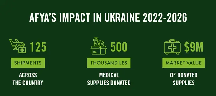 Since the earliest days of the war, Afya has delivered more than 125 shipments of lifesaving medical aid—over 500,000 pounds of supplies valued at more than $9 million—to hospitals, clinics, rehabilitation centers, and frontline providers at no cost to those who need them. We rescued these surplus medical supplies from hospitals in the New York area, where they may have been landfilled or incinerated. And, instead, they are touching the lives of 1 million people in Ukraine.